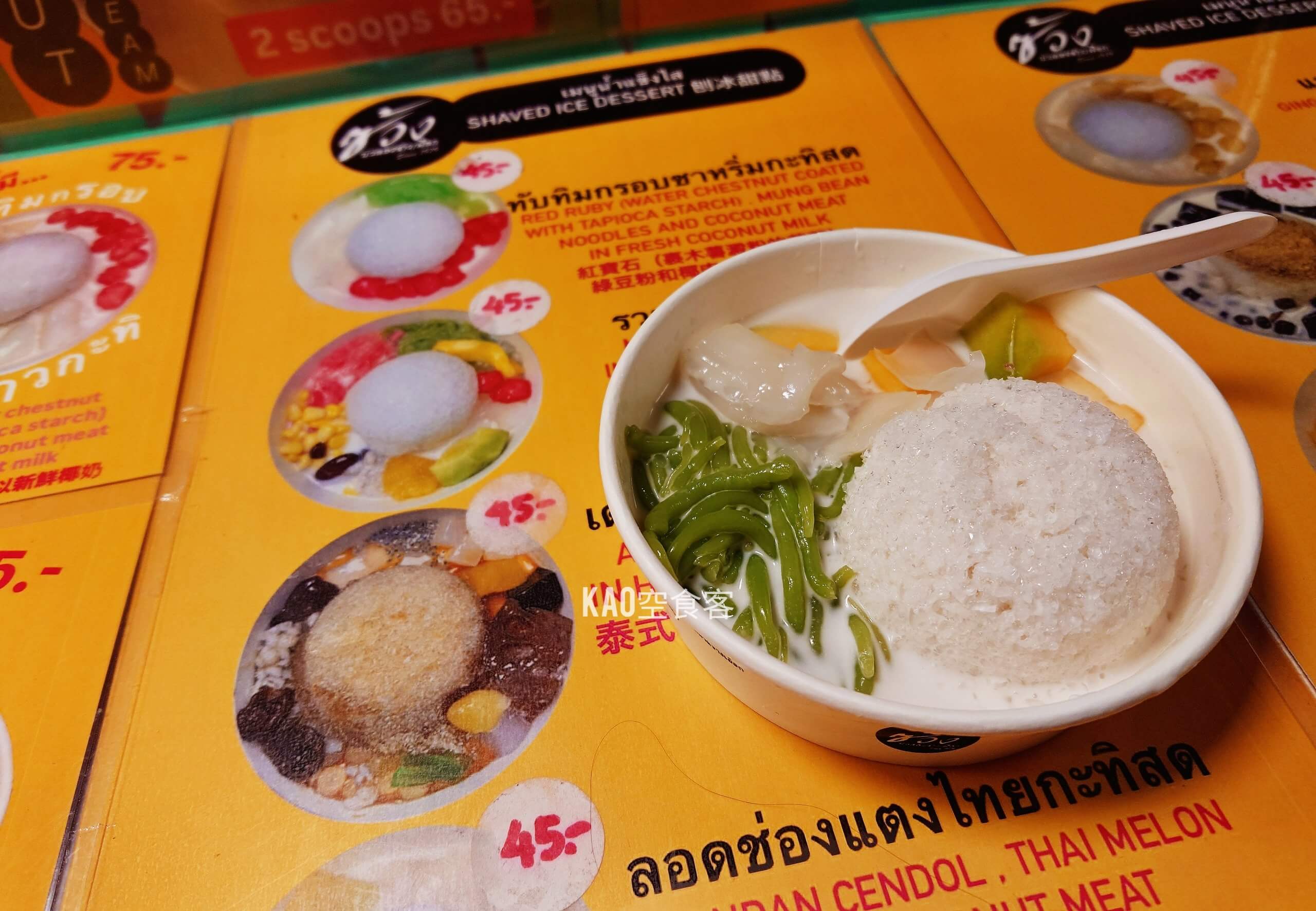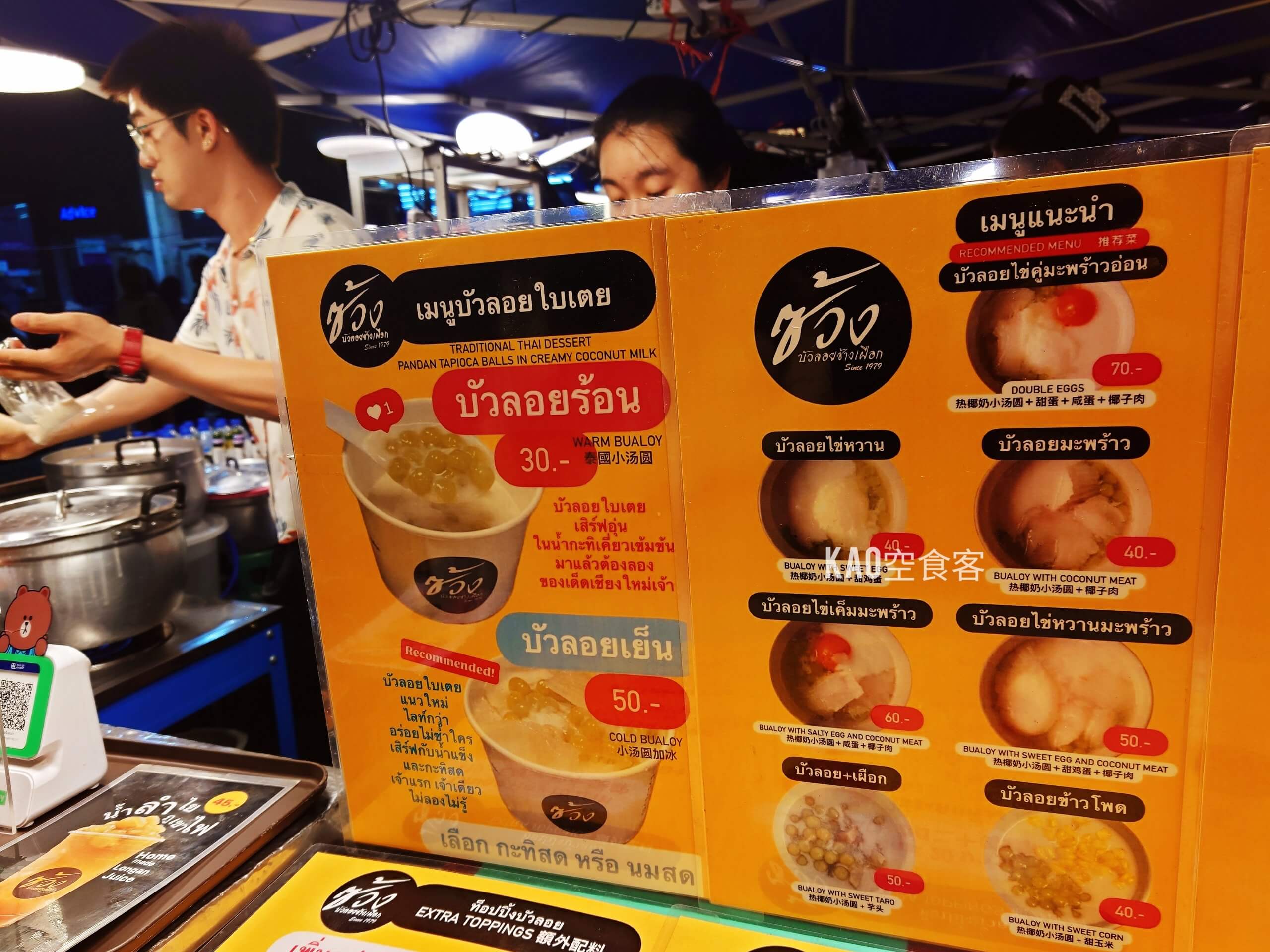 招牌甜品有雙蛋椰肉湯圓、鹹蛋椰肉和芋頭湯圓等,價錢漂亮40-70左右。Bualoy在泰國有著悠久的歷史,跟台灣的湯圓相同;象徵吉祥團圓。使用糯米粉搓成小球,熱水滾煮後搭配椰奶和其他泰式餡料。