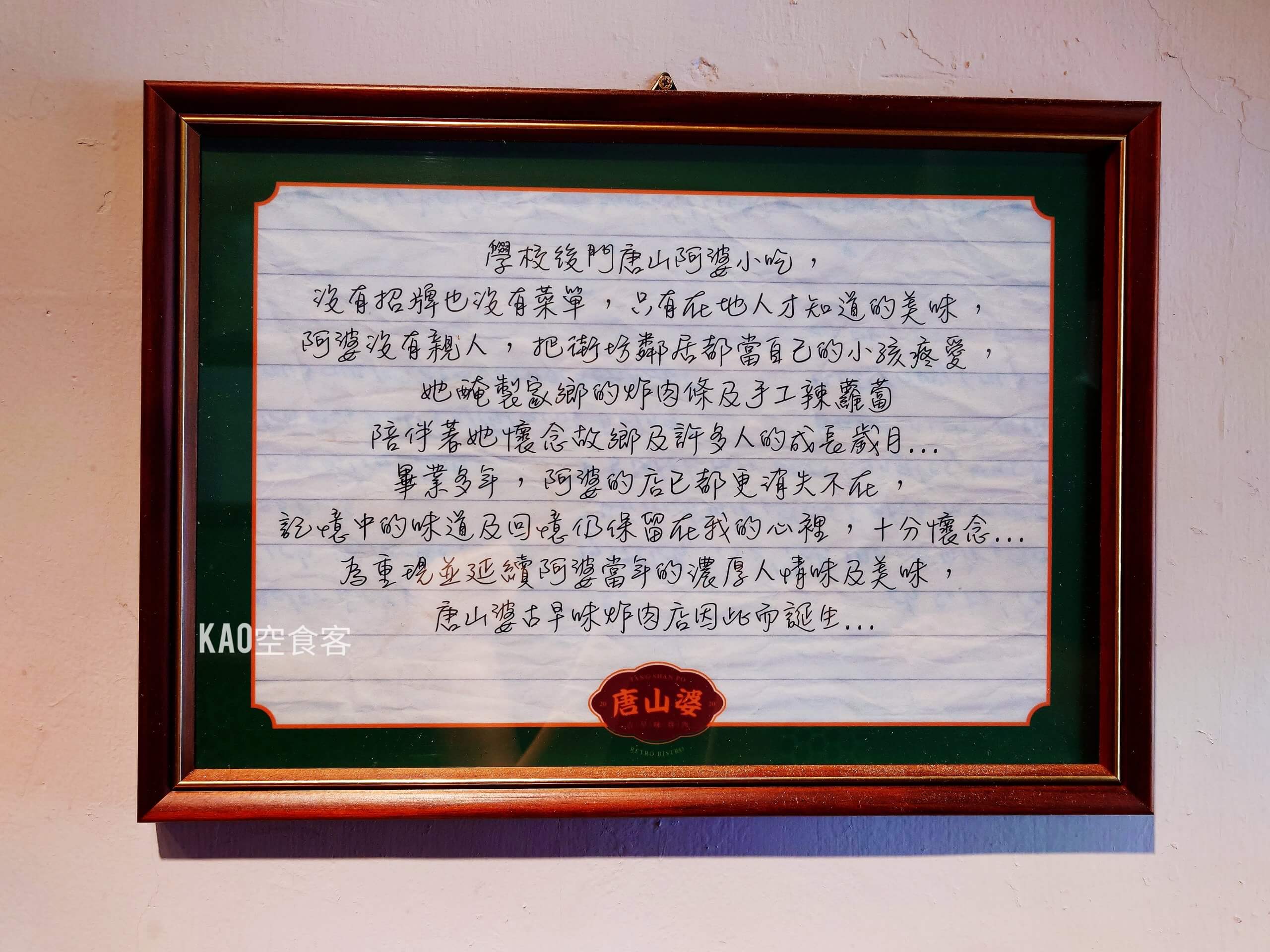 學校後門賣炸肉條和辣蘿蔔乾的”唐山阿婆”,沒有親人卻把身邊人當作自家親人一般疼愛。唐山阿婆已經不在,創辦人想透過重現那傳統滋味和人情味,而有了現在的”唐山婆古早味炸肉”。