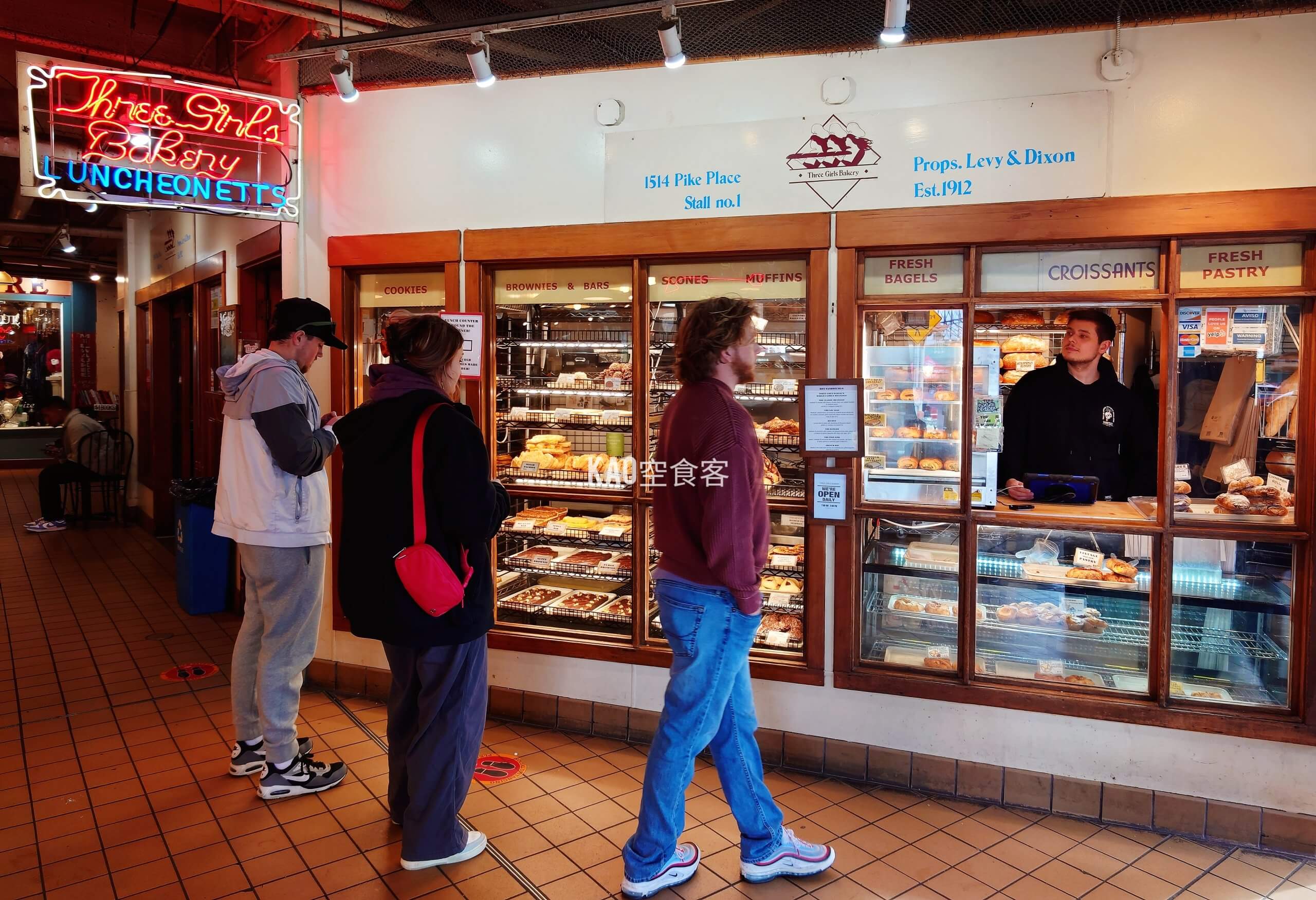 Three Girls Bakery是西雅圖Pike Place Markeet最具代表性的烘焙店,創立於1912年,由三位女性創辦。同時也是西雅圖第一家由女性取得營業執照的商業機構,不可不說是市場內的歷史地標。