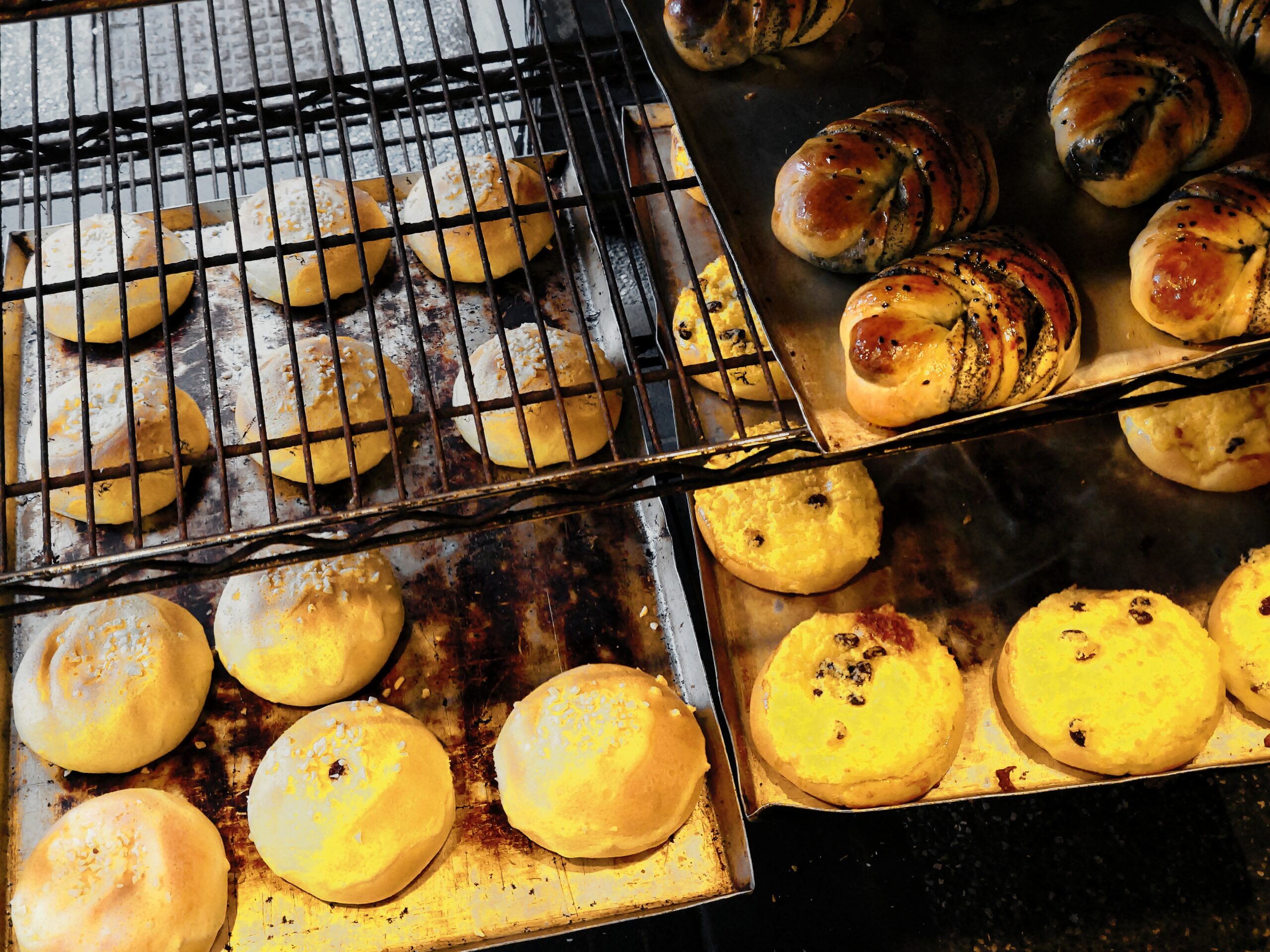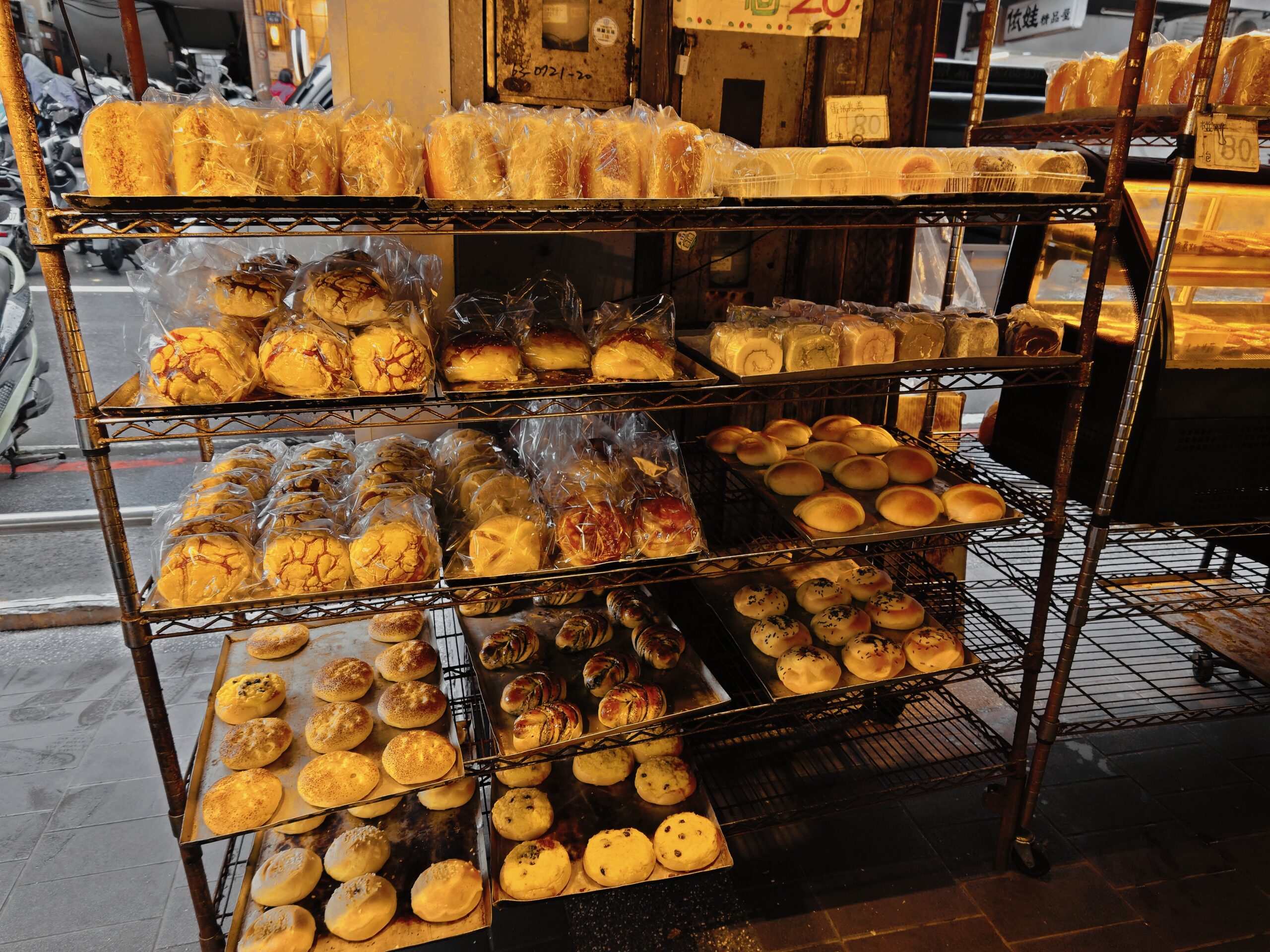 沒有招牌只是幾個鐵架就隱藏在騎樓下,每天下午一點出爐是許多基隆人學生時期的小點心。一出爐老遠就能聞到大蒜麵包的香氣,一大條才35元,且三條才一百元。其他麵包都是20元,雖然選擇沒有一般麵包店多,但味道和口感一點不差。
